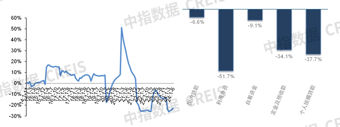 图:2014年至今全国房企到位资金同比增速及2024年1-6月各项资金来源同比增速对比
