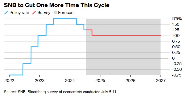 根据 7 月 5 日至 11 日进行的调查,瑞士央行最后一次降息 25 个基点将在 9 月进行,此前该行在3月和6月已进行了两次降息。这将使基准利率降至 1%。