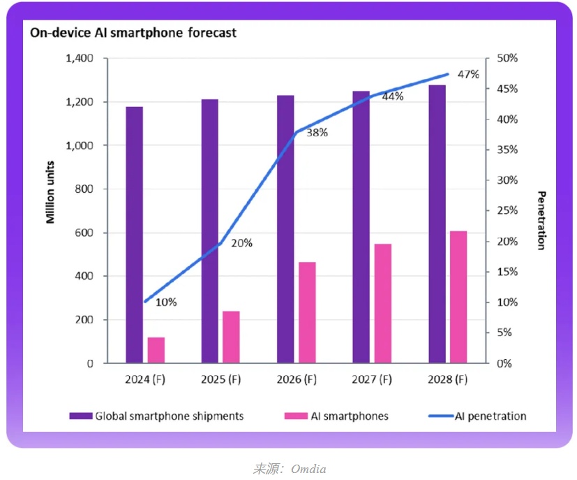 智通财经APP获悉,Omdia发文称,2024年,On-device AI智能手机的总出货量预计为1.19亿部,占总出货量的10%。之后,预计销量将逐年稳步增长,2028年将达到6.06亿部,复合年增长率为38%。从2026年起,渗透率预计将在2028年提高到47%。