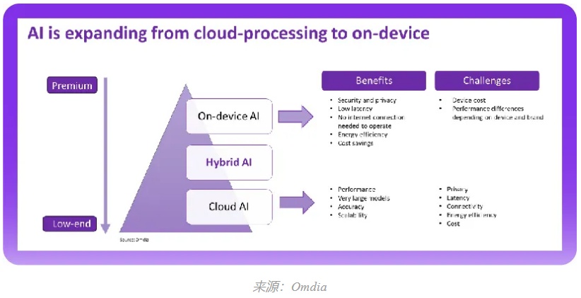 On-device AI和Cloud-AI两种方案均存在明显优势和劣势。首先,On-device AI方案借助端侧的芯片算力,可以实现低时延的响应和个性化的AI服务,同时可以将隐私数据保留至端侧,消除用户对数据安全的担忧。但是,目前支持On-device AI智能手机需要高规格的硬件,硬件成本高,用户的购买设备的成本自然也高。