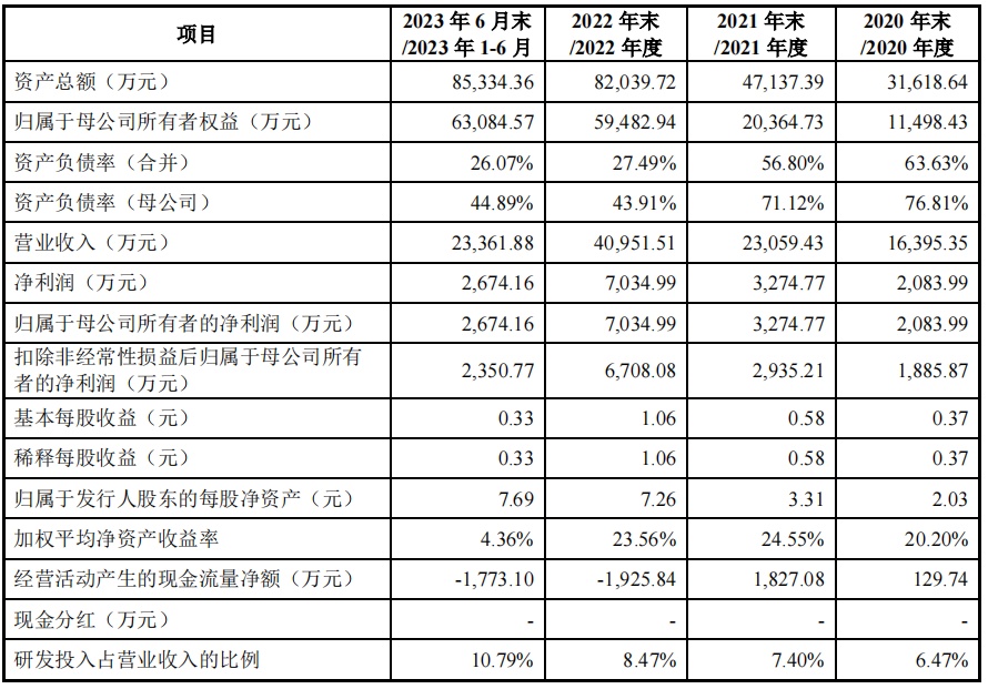 财务方面,公司分别于2020年、2021年、2022年、2023年上半年分别实现营收约为1.64亿、2.31亿、4.1亿、2.34亿人民币,净利润分别为2083.99万、3274.77万、7034.99万、2674.16万人民币。