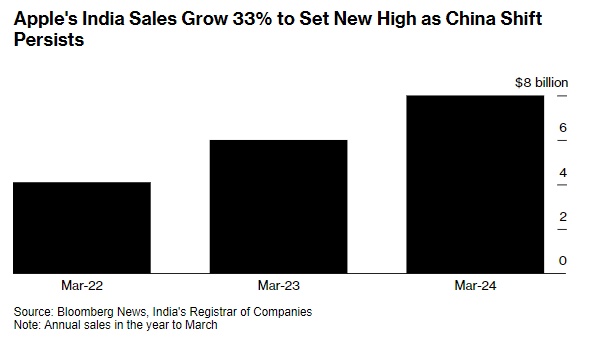 据知情人士透露,截至今年3月的12个月里,该公司在印度的营收从上年同期的60亿美元增长了约33%。该知情人士表示,其中iPhone占销售额的一半以上。