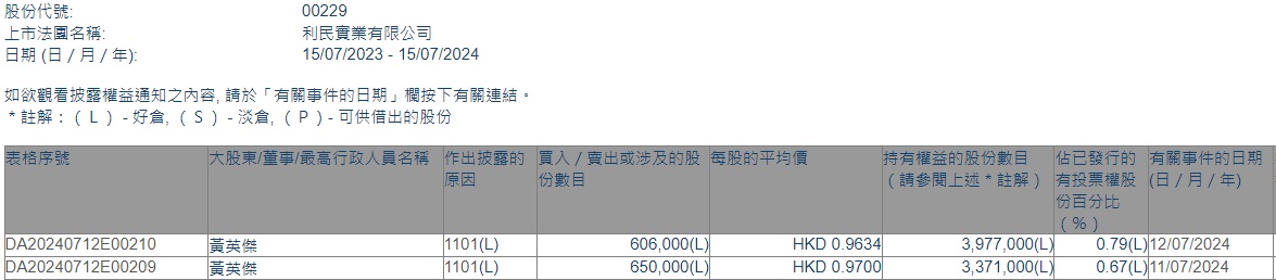 智通财经APP获悉,香港联交所最新资料显示,非执行董事黄英杰分别于7月11日、12日增持利民实业(00229)65万股、60.6万股,每股作价分别为0.97港元、0.9634港元,总金额约为121.88万港元。增持后最新持股数目为397.7万股,持股比例为0.79%。