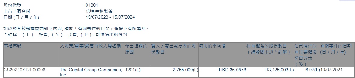 Inc.减持信达生物(01801)275.5万股,每股作价约为36.0878港元,总金额约9942.8万港元。减持后最新持股数目约为1.13亿万股,持股比例为6.97%。