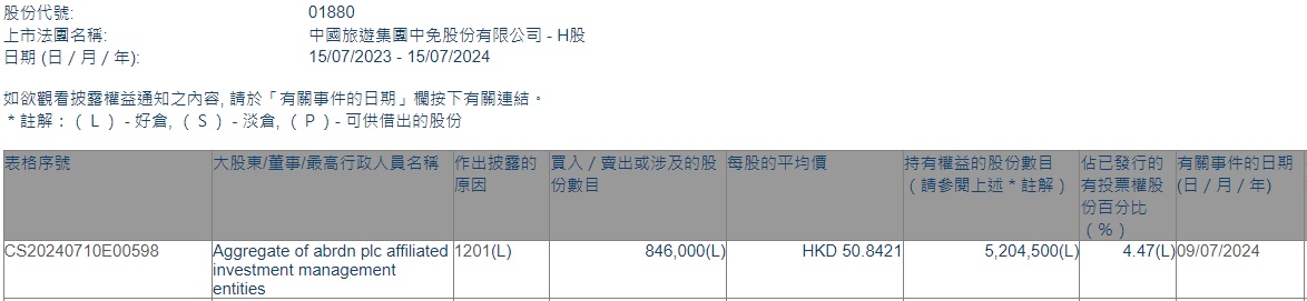 智通财经APP获悉,香港联交所最新资料显示,7月9日,Aggregate of abrdn plc affiliated investment management entities减持中国中免(01880)84.6万股,每股作价50.8421港元,总金额约为4301.24万港元。减持后最新持股数目为520.45万股,最新持股比例为4.47%。