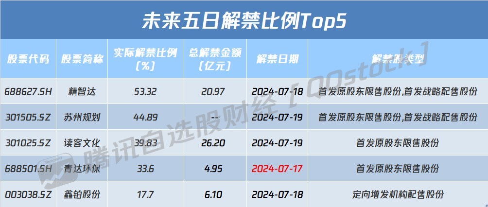从解禁比例来看,未来五日精智达实际解禁比例达53.32%,其次解禁比例居前的分别为苏州规划和读客文化。