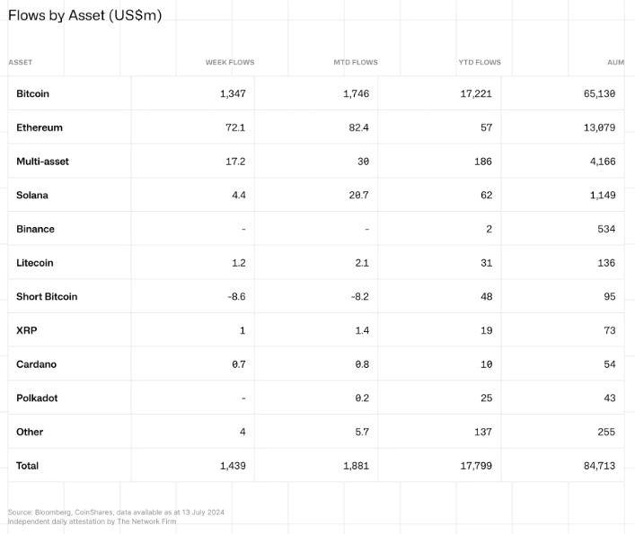 以太坊和其他加密货币的投资产品也吸引了资金流入。其中,以太坊投资产品在上周吸引了7200万美元的资金流入,为3月以来的最大规模。根据CoinShares的数据,投资者对美国现货以太坊ETF即将获批的预期是推动以太坊投资产品吸引资金流入的主要原因。