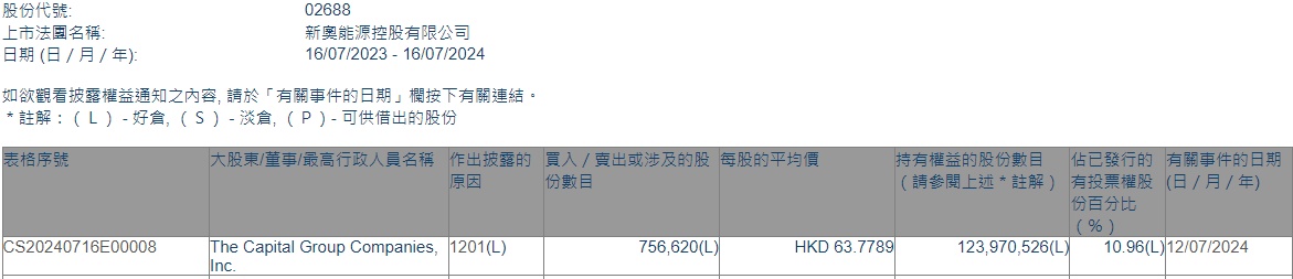Inc.减持新奥能源(02688)75.662万股,每股作价为63.7789港元,总金额约为4825.64万港元。减持后最新持股数目约为1.24亿股,持股比例为10.96%。