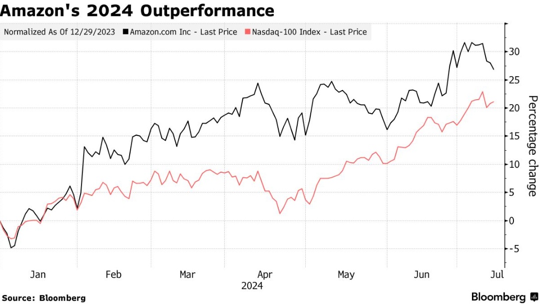 尽管Prime Day的销售不再是股价上涨的直接驱动因素,但出色的表现将进一步证明亚马逊股价在2024年有望上涨27%,推动公司市值超过2万亿美元。这一预期涨幅使亚马逊的市值增长速度超过了纳斯达克100指数的21%。
