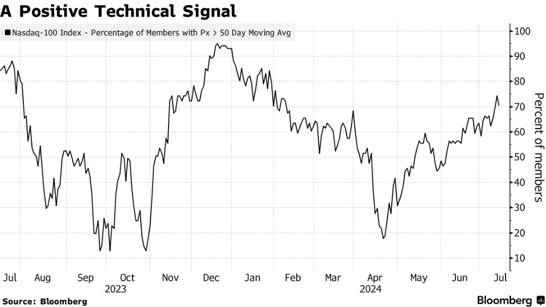市场广度改善的一个积极信号是,纳斯达克100指数成分股中超过70%的股票交易价格高于50日移动平均线。这一比例接近2月份以来的最高水平,与4月份相比出现了戏剧性的逆转,当时只有不到20%的股票交易价格高于这一备受关注的水平。而这种市场广度的改善也可能对亚马逊等公司股票表现的一个积极背景,因为整个市场情绪的提升可能会对个别股票的表现产生正面影响,尤其是在像Prime Day这样的关键事件期间。