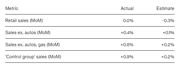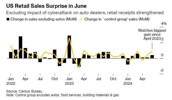 其他数据方面,用于计算国内生产总值(GDP)的零售额控制组在6月强劲增长0.9%,为自2023年4月以来的最大增幅。该指标不包括食品服务、汽车经销商、建筑材料商店和加油站。