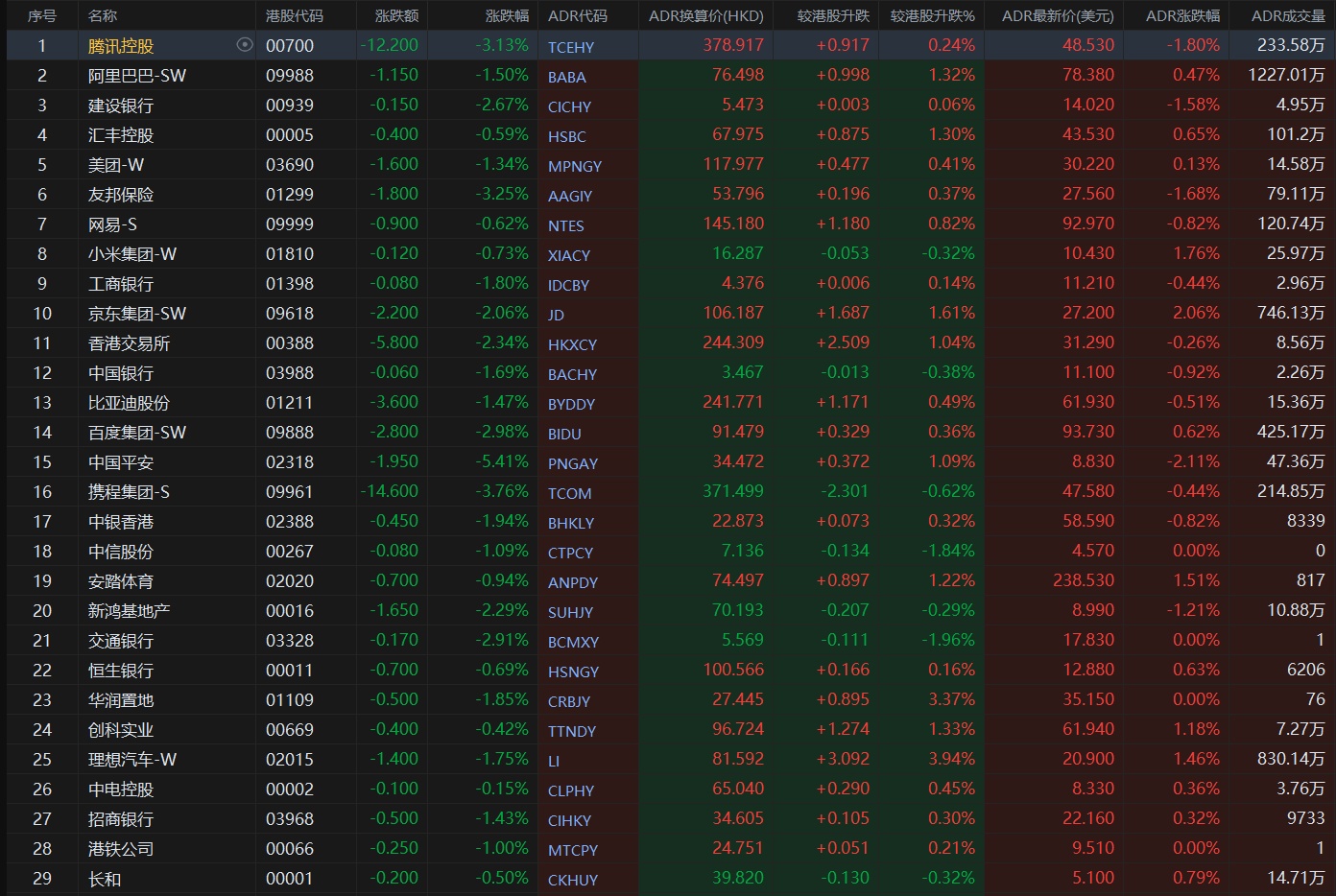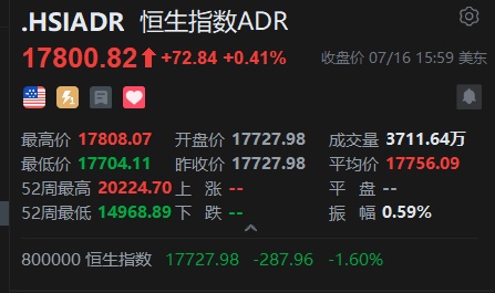 智通财经APP获悉,周二美股三大指数集体上涨,恒生指数ADR上涨,按比例计算,收报17800.82点,较香港收市上涨72.84点或0.41%。