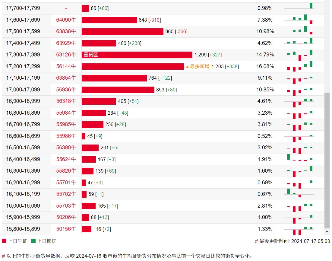 牛证街货重货区在17300-17399区间,该区间最新牛证数量为1299张,较上一交易日增加327张;最多新增在17200-17299区间,该区间最新牛证数量为1203张,较上一交易日增加338张。