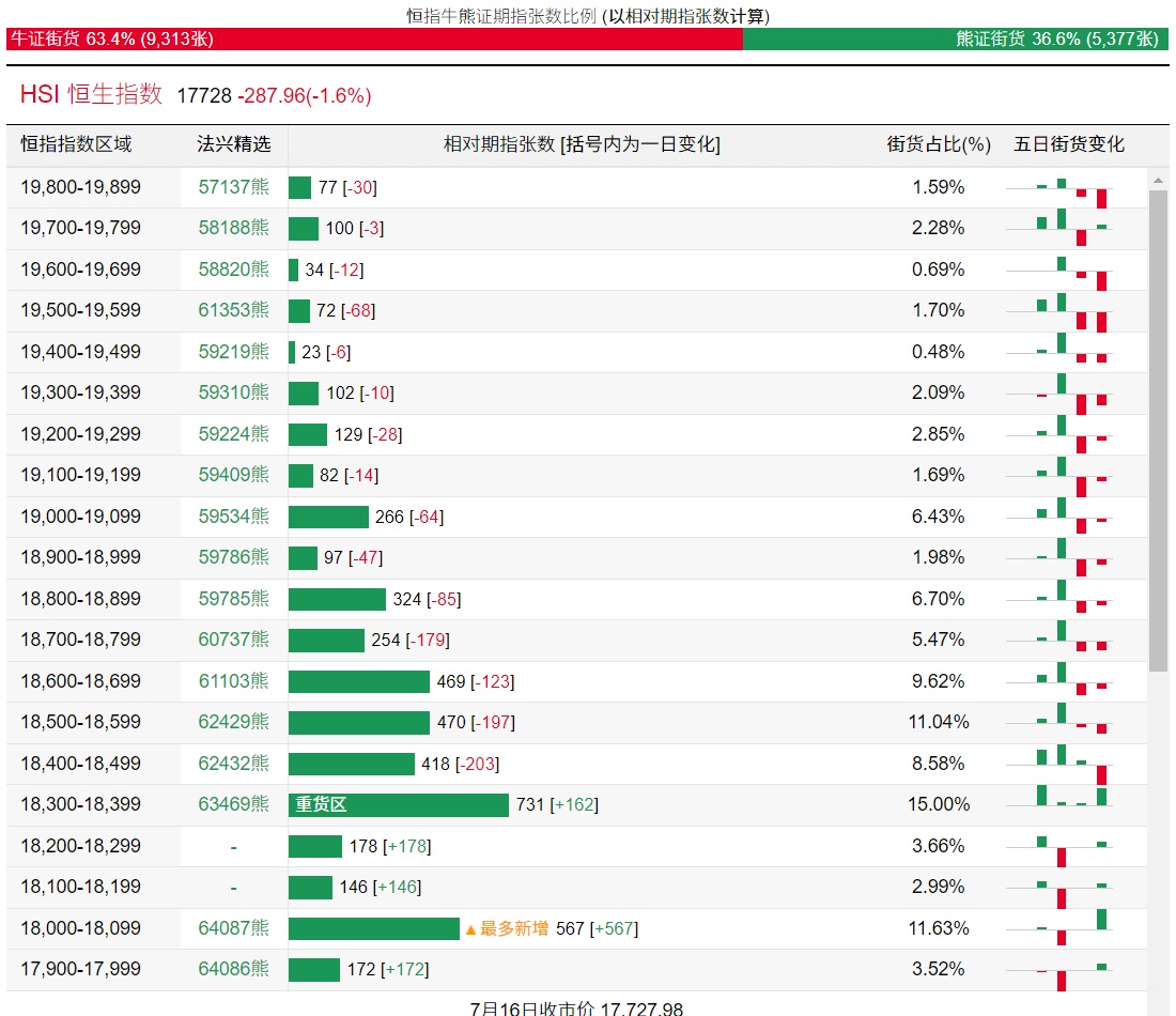智通财经APP获悉,截至7月17日,恒指最新的牛熊街货比例为63:37。