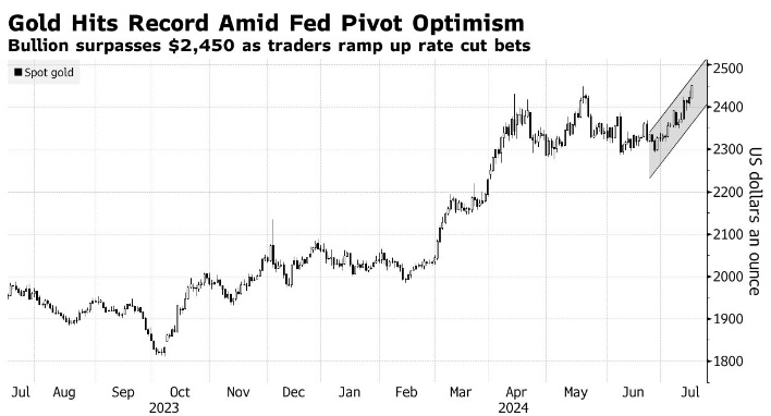 智通财经获悉,随着市场对美联储降息预期升温,以及一些交易员加大了对特朗普连任的押注,国际金价创下历史新高。现货黄金一度升至2469.66美元/盎司的高位,超过了5月份创下的历史最高纪录。金价上涨之际,美国通胀放缓的迹象加剧了人们对美联储将很快开始降息的猜测。高利率对黄金来说往往是负相关的,因为黄金没有利息。