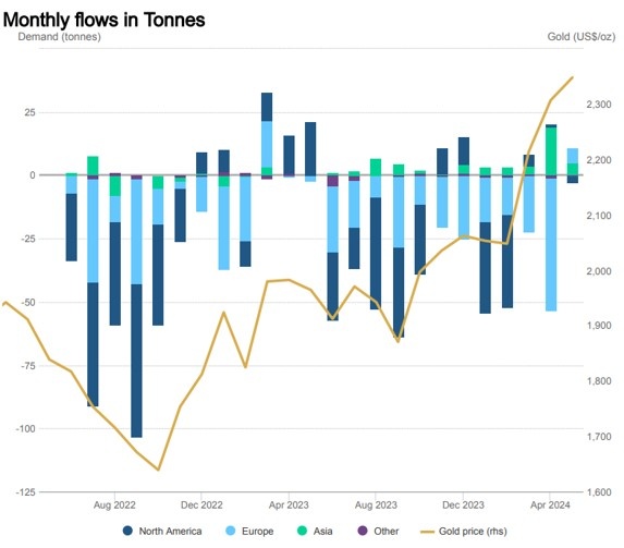今年5月,全球黄金ETF资金流入12个月来首次为正。截止至5月,全球黄金ETF持有3087.9吨黄金。黄金ETF管理的资产规模(AUM)升至2,340亿美元,增长2%。资产管理规模的增长是由于金属仓位增加和金价上涨的共同作用。这是自2022年4月以来全球黄金支持基金报告的最高资产管理规模。