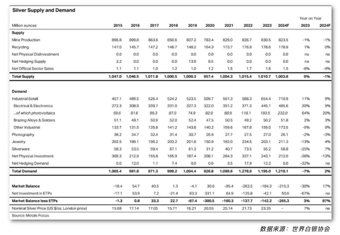 供给侧方面,世界白银协会《2024年世界白银调查》预测,今年全球白银供给将下降约0.68%,白银储量持续下探,仅为2021年库存高点的70%,总体供应缺口将扩大17%。至215.30百万盎司(6697吨),有望连续四年保持供不应求局面。