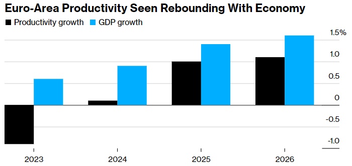 如果生产率不能实现充分的改善,支撑欧洲央行政策立场的预测可能会处于危险之中。分析师目前预计,在本周的会议上保持不变后,欧洲央行官员将在秋季恢复降息。