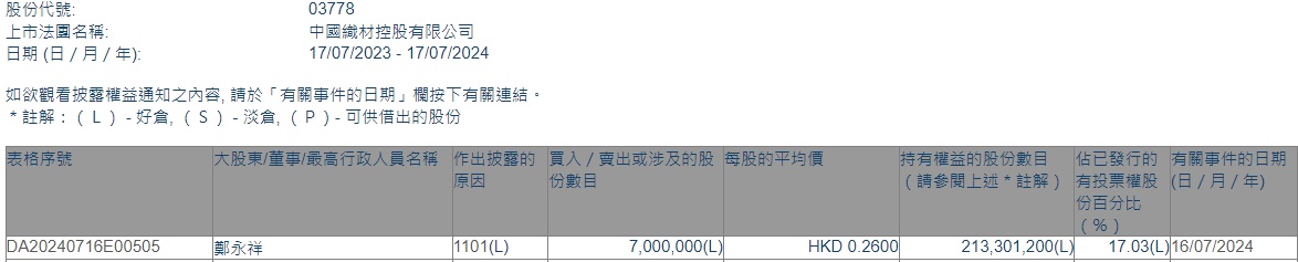 智通财经APP获悉,香港联交所最新数据显示,7月16日,执行董事郑永祥增持中国织材控股(03778)700万股,每股作价0.26港元,总金额为182万港元。增持后最新持股数目约为2.13亿股,持股比例为17.03%。