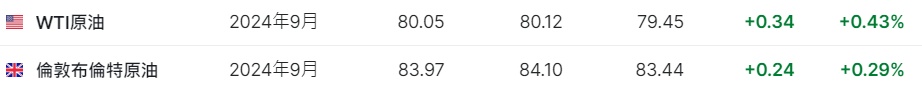 3. 截至发稿,WTI原油涨0.43%,报80.05美元/桶。布伦特原油涨0.29%,报83.97美元/桶。