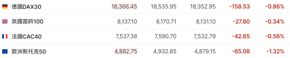 2. 截至发稿,德国DAX指数跌0.86%,英国富时100指数跌0.34%,法国CAC40指数跌0.56%,欧洲斯托克50指数跌1.32%。