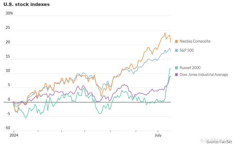 根据FactSet的数据,美国股市周三下跌,标普500指数跌1.39%。以科技股为主的纳斯达克综合指数在7月10日创下历史收盘新高后,周三暴跌2.77%,而蓝筹股道琼斯工业平均指数则上涨0.59%。罗素2000指数收跌1.06%,止步五连涨。该指数在截至周二的五个交易日内飙升了11.5%,截至周三,该指数今年迄今已上涨11.1%。