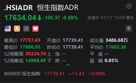 智通财经APP获悉,周三美股三大指数涨跌不一,恒生指数ADR下跌,按比例计算,收报17634.04点,较香港收市下跌105.37点或0.59%。