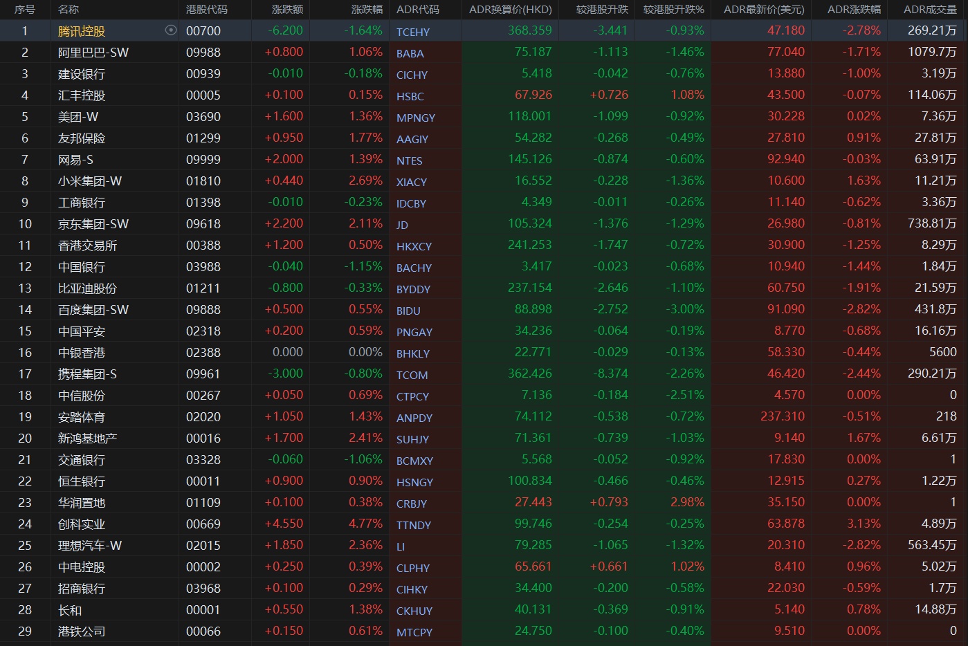 大型蓝筹股近乎全线下跌,汇丰控股收报67.926港元,较香港收市上涨1.08%;腾讯控股收报368.359港元,较香港收市下跌0.93%。
