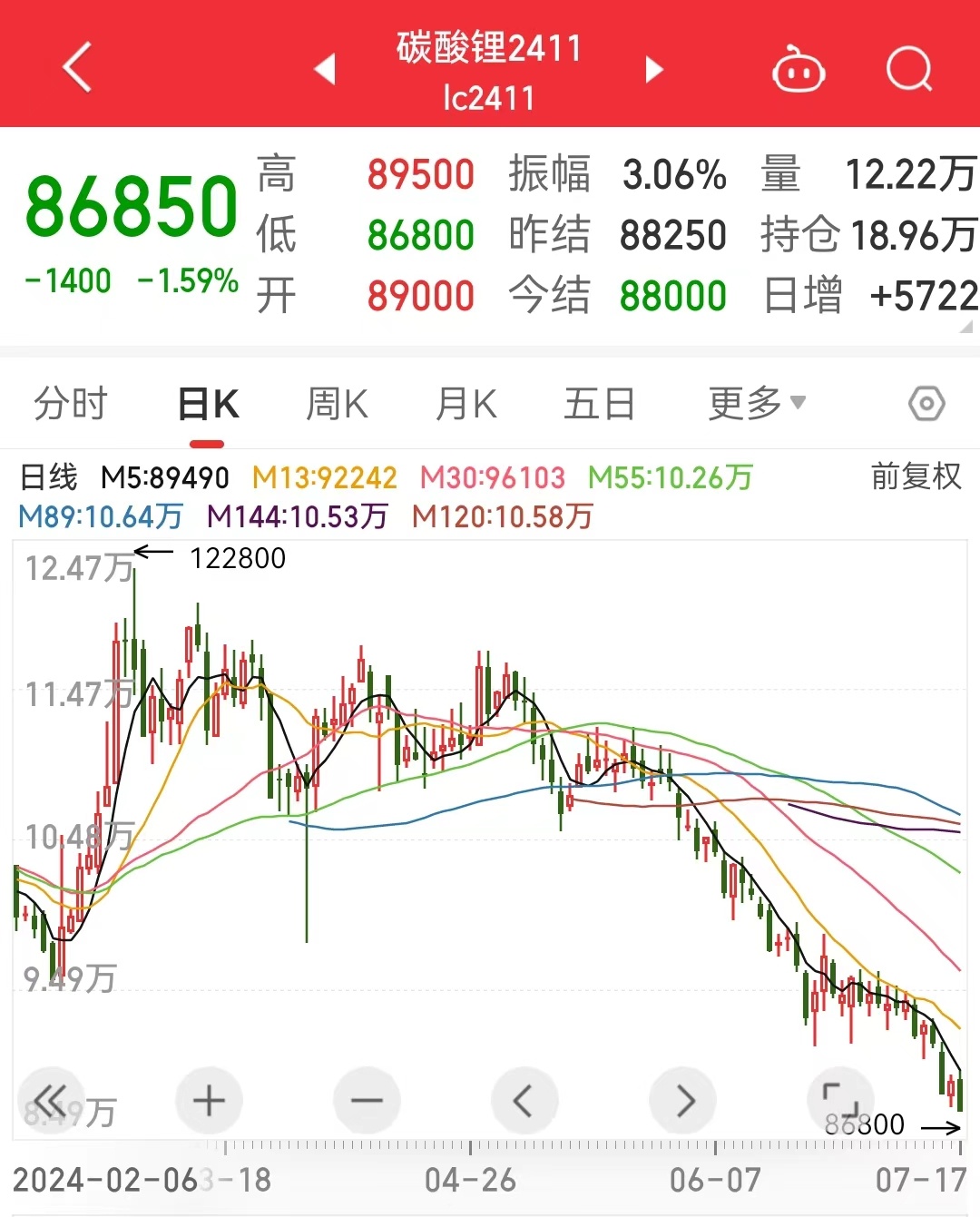 智通财经APP获悉,供给过剩叠加需求持续不足,近期碳酸锂价格“跌跌不休”。7月17日,碳酸锂期货主力合约2411跌1.59%至86850元/吨,再创年内新低。现货方面,据上海有色网数据,昨日电池级碳酸锂均价报87350元/吨,较上一日跌600元/吨,工业级碳酸锂报82400元/吨,逼近行业供需平衡成本线8万元/吨。