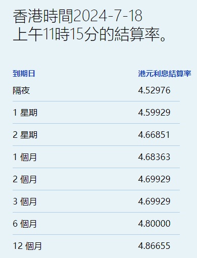 智通财经APP获悉,7月18日,港元拆息个别发展,与楼按相关的一个月拆息报4.68363%,升0.982基点,连升三日,是6月26日以来新高。隔夜息跌1.834基点,报4.52976%。