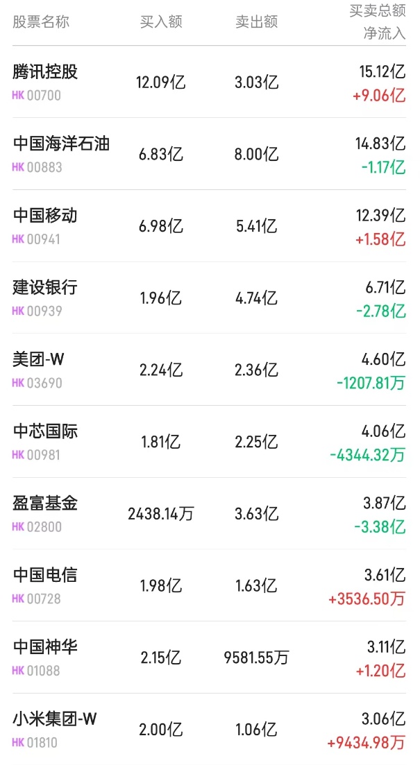 中国移动(00941)、中国电信(00728)分别获净买入1.3亿、3536万港元。消息面上,摩根大通发布研报称,重申对三大电信股“增持”评级。该行看好中移动收益率达7%及股息年均复合增长率达7%;在波动市场中的防御性高;相对于中电信及联通,中移动股价跑输,具追落后潜力。该行预期电信股第二季收入疲弱但盈利稳健。