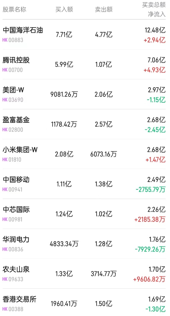 北水净买入最多的个股是腾讯(00700)、小米集团-W(01810)、中海油(00883)。北水净卖出最多的个股是盈富基金(02800)、建设银行(00939)、港交所(00388)。