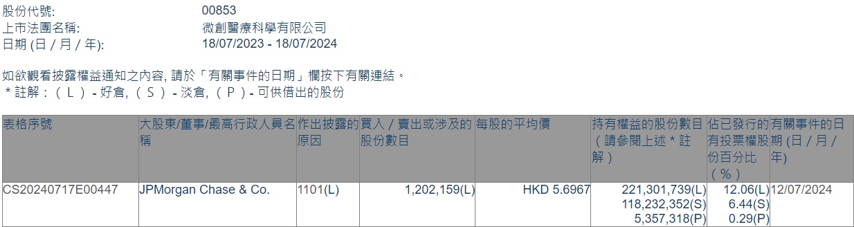 智通财经APP获悉,香港联交所最新资料显示,7月12日,小摩增持微创医疗(00853)120.2159万股,每股作价5.6967港元,总金额约为684.83万港元。增持后最新持股数目约为2.21亿股,最新持股比例为12.06%。