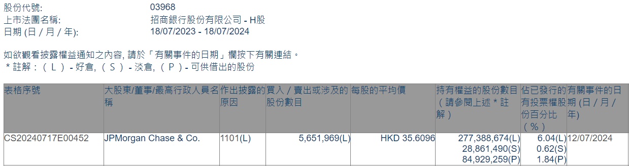 智通财经APP获悉,香港联交所最新资料显示,7月12日,摩根大通增持招商银行(03968)565.1969万股,每股作价35.6096港元,总金额约为2.01亿港元。增持后最新持股数目约为2.77亿股,持股比例为6.04%。