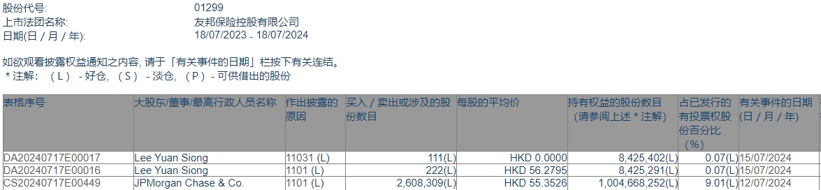 智通财经APP获悉,香港联交所数据显示,7月12日,小摩增持友邦保险(01299)260.8309万股,每股作价55.3526港元,总金额约为1.44亿港元。增持后最新持股数目约为10.05亿股,持股比例为9.01%。