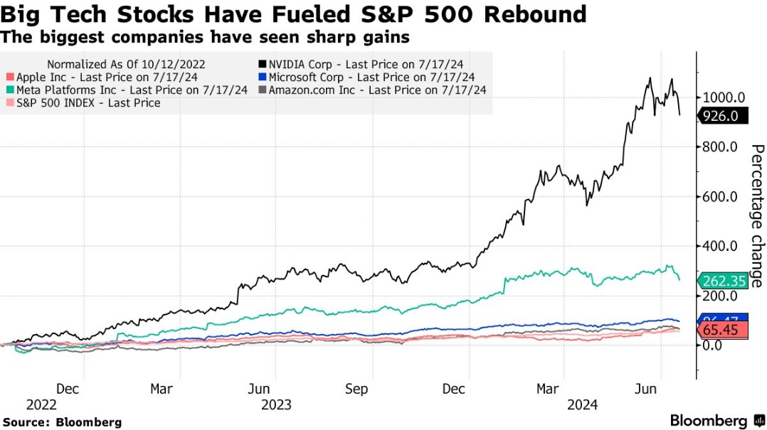 尽管科技股在某些日子里因担忧而大跌,但它们仍保持在历史高位附近。自2022年10月触底以来,标普500指数近一半的涨幅集中在六只股票上:苹果、微软、英伟达、Alphabet、亚马逊和Meta Platforms。英伟达今年的市值增加了近2万亿美元,尽管股价今年已上涨近140%,但分析师们依然建议买入。
