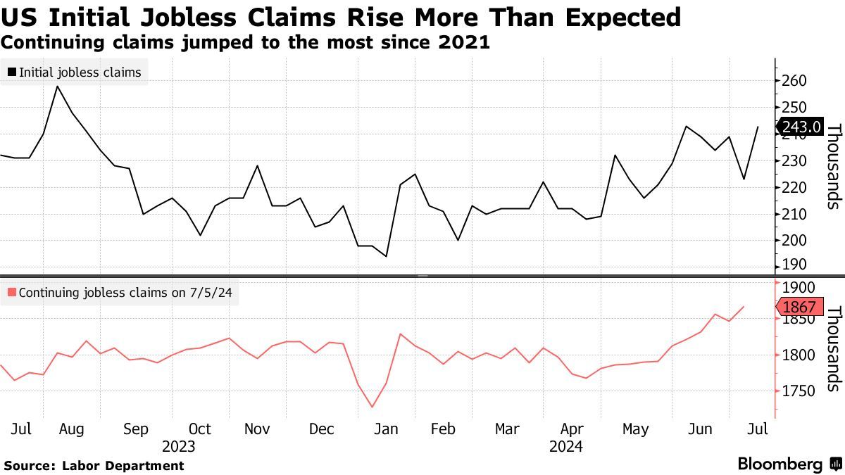 根据美国劳工部周四公布的数据,截至7月13日的一周首次申请失业救济金人数较上一统计周大幅增加2万人,达到24.3万人,这一数值与2023年8月以来的最高水平几乎持平。最新的初请失业金人数超过经济学家们普遍预期的22.9万人。