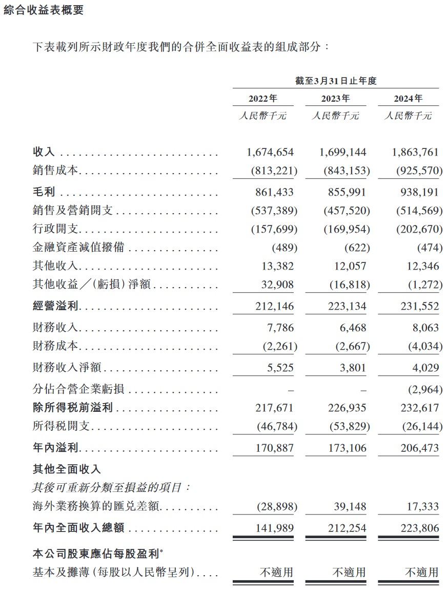 财务方面,截至2022年3月31日、2023年3月31日及2024年3月31日,公司的收入分别为16.75亿元、16.99亿元及18.64亿元人民币。同期,实现年内溢利分别为1.71亿元、1.73亿元及2.06亿元人民币。