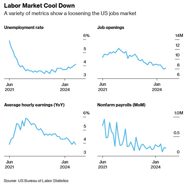 美联储青睐的通胀指标已降至2.6%,一度过热的劳动力市场已放缓至疫情前的水平。虽然美联储官员们继续将劳动力市场描述为强劲的,但他们也表示,随着职位空缺数量的稳步下降和失业率的逐步上升,劳动力市场可能正接近一个转折点。