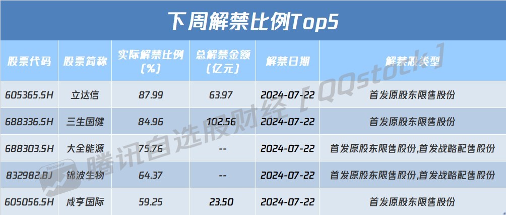 从解禁比例来看,下周立达信实际解禁比例达87.99%,其次解禁比例居前的分别为三生国健和大全能源。
