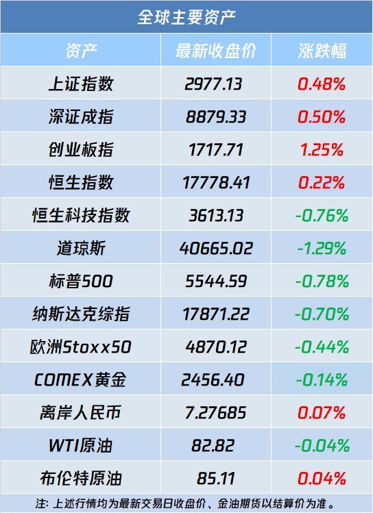 自选哥提示:隔夜美股进入全线下挫的状态,这也意味着前几天成为市场避风湾的“轮动交易”逻辑也偃旗息鼓。其他市场方面,COMEX黄金期货跌0.14%,报2456.4美元/盎司;纽约商品交易所8月交货的轻质原油期货收于每桶82.82美元,跌幅为0.04%。