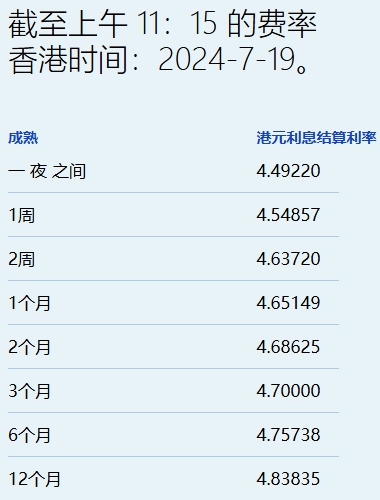 智通财经APP获悉,7月19日,港元拆息近乎全线走低,其中,与楼按相关的一个月拆息结束三连升,报4.65149%。隔夜息跌近4基点至4.4922%,再失守4.5%。不过,反映银行资金成本的三个月拆息则微升至4.7%,此外一周拆息报4.54857%,下跌5基点。六个月及一年期分别降至4.75738%和4.83835%。