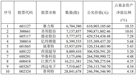 从其前十大重仓股来看,第一、二大重仓股依然为赛力斯(601127.SH)、圣邦股份(300661.SZ),相比一季度赛力斯持股数没有变化,而圣邦股份持股是有些许减少,但他们的净值比例都上升到了10%以上。此外,一季度锦浪科技(300763.SZ)、晶澳科技(002459.SZ)退出前十大重仓股,相应的华秦科技(688281.SH)、鸿远电子(603267.SH)出现在前十大重仓股中。