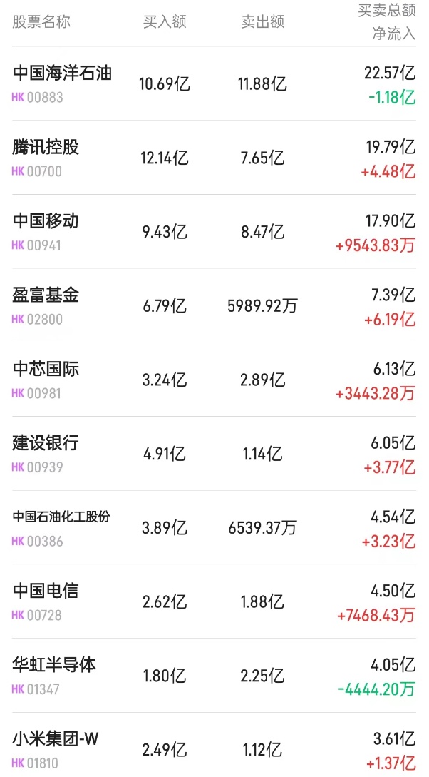 中国移动(00941)、中国电信(00728)分别获净买入1.5亿、7468万港元。消息面上,摩根大通发布研报称,重申对三大电信股“增持”评级。该行看好中移动收益率达7%及股息年均复合增长率达7%;在波动市场中的防御性高;相对于中电信及联通,中移动股价跑输,具追落后潜力。该行预期电信股第二季收入疲弱但盈利稳健。
