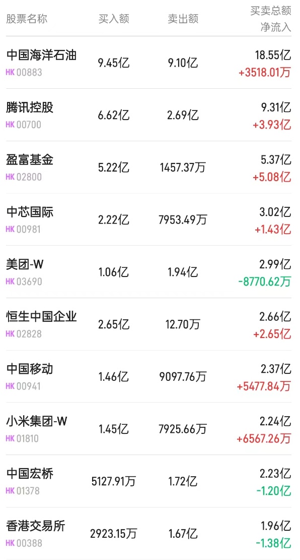 腾讯(00700)获净买入8.41亿港元。消息面上,大摩发布研报称,预计腾讯2023年第二季度的收入和经调整经营溢利将分别同比增长7%和25%。同时,腾讯在第二季度的股票回购量超过大股东Prosus的抛售量。里昂则预计腾讯2024年第二季度业绩稳健,在游戏反弹和广告强劲增长的推动下,预计总收入同比增长8%,达到1616亿元人民币;经调整经营溢利同比增长24%,达到571亿元人民币。
