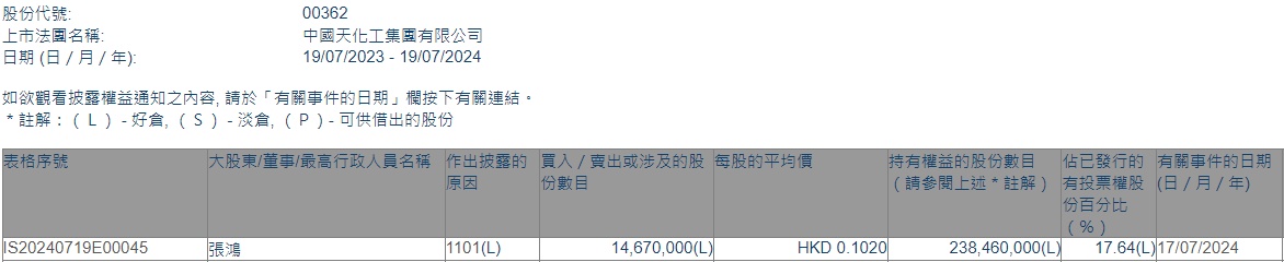 智通财经APP获悉,香港联交所最新数据显示,7月17日,大股东张鸿增持中国天化工(00362)1467万股,每股作价0.102港元,总金额为149.634万港元。增持后最新持股数目约为2.38亿股,持股比例为17.64%。