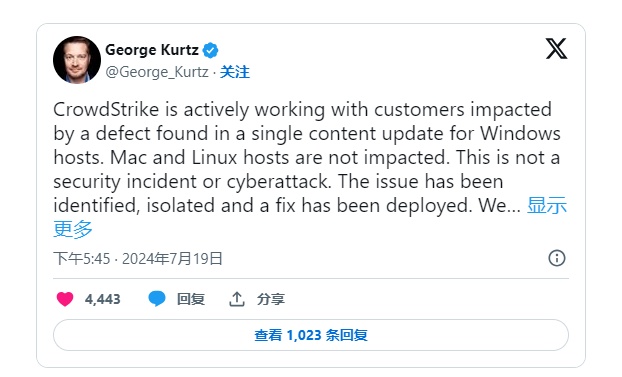 首席执行官 George Kurtz 周五在 X 上发表的声明中表示: “这不是安全事件或网络攻击。问题已被发现、隔离,并已部署修复程序。”