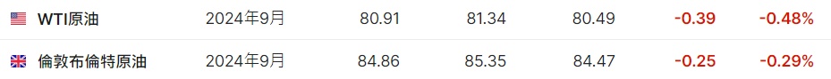 3. 截至发稿,WTI原油跌0.48%,报80.91美元/桶。布伦特原油跌0.29%,报84.86美元/桶。