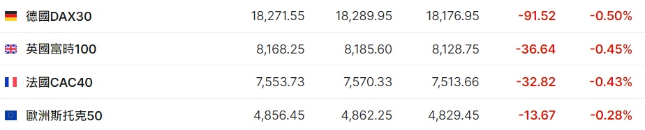 2. 截至发稿,德国DAX指数跌0.50%,英国富时100指数跌0.45%,法国CAC40指数跌0.43%,欧洲斯托克50指数跌0.28%。