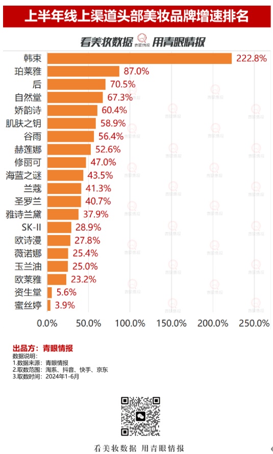 2024年上半年,上美股份主品牌韩束在抖音平台的销售额已突破34亿元,超越了2023年全年业绩。此外,根据青眼情报数据显示,韩束在上半年线上渠道TOP20品牌中,以222.8%的增速一骑绝尘,成为唯一一个实现三位数增长的美妆品牌,彰显了其在线上多渠道的可持续增长潜力。